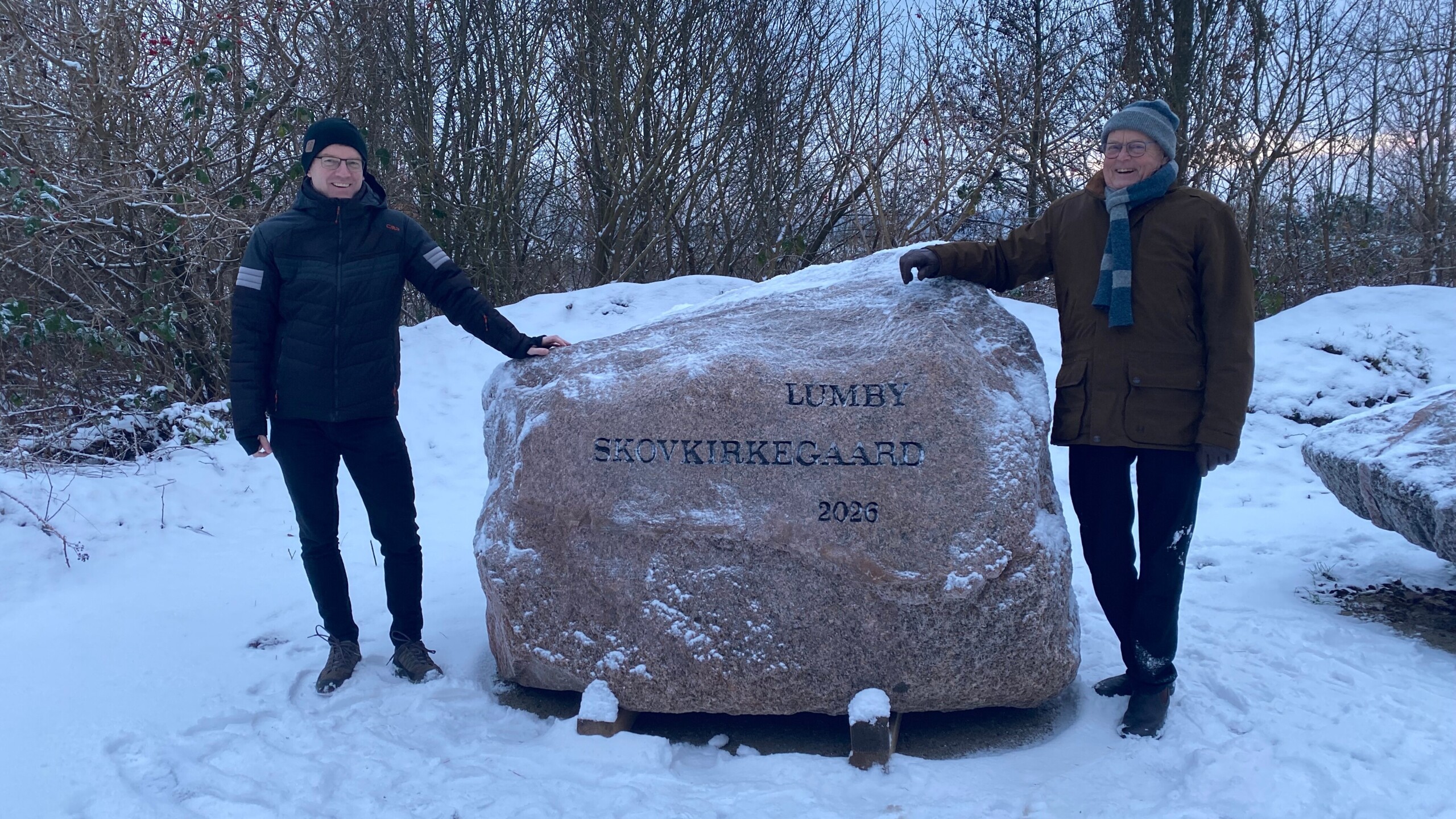 Vi mødes ved parkeringspladsen, der ligger 700 meter fra Lumby kirke og umiddelbart syd for Lumby Præsteskov, der er en skov på 4,2 hektar. Den fremtidige skovkirkegård kommer til at blive placeret i den nordlige ende af præsteskoven. En stor sten på 8 tons og med påskriften ”LUMBY SKOVKIRKEGAARD 2026” ligger foran os på p-pladsen, og Erik Toft Knudsen fortæller, at stenen snart skal overflyttes til en af de to indgange til den nye skovkirkegård.