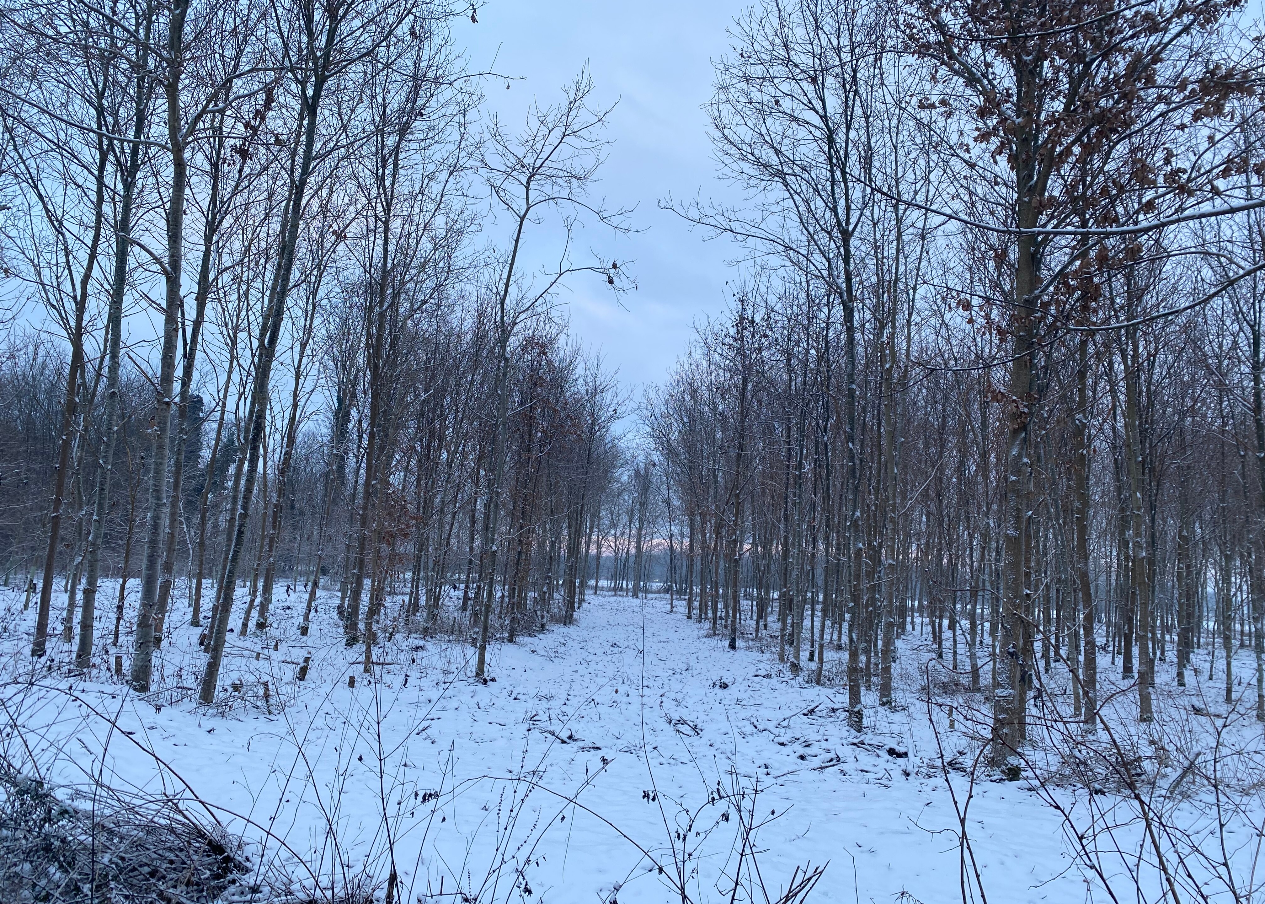 Efter få minutters vandring kommer vi til den nordlige del af skoven, der er udset til at være skovkirkegård. Omkring skovkirkegården går der en grøft – ”kirkegrøften”, som Erik kalder den. Over grøften er der lagt simple træbroer, og to af dem danner den officielle indgang til skovkirkegården. Hver indgang er smukt flankeret af æbletræer, og ved hver indgang skal der ligge en tonstung sten med påskriften ”LUMBY SKOVKIRKEGAARD 2026”.