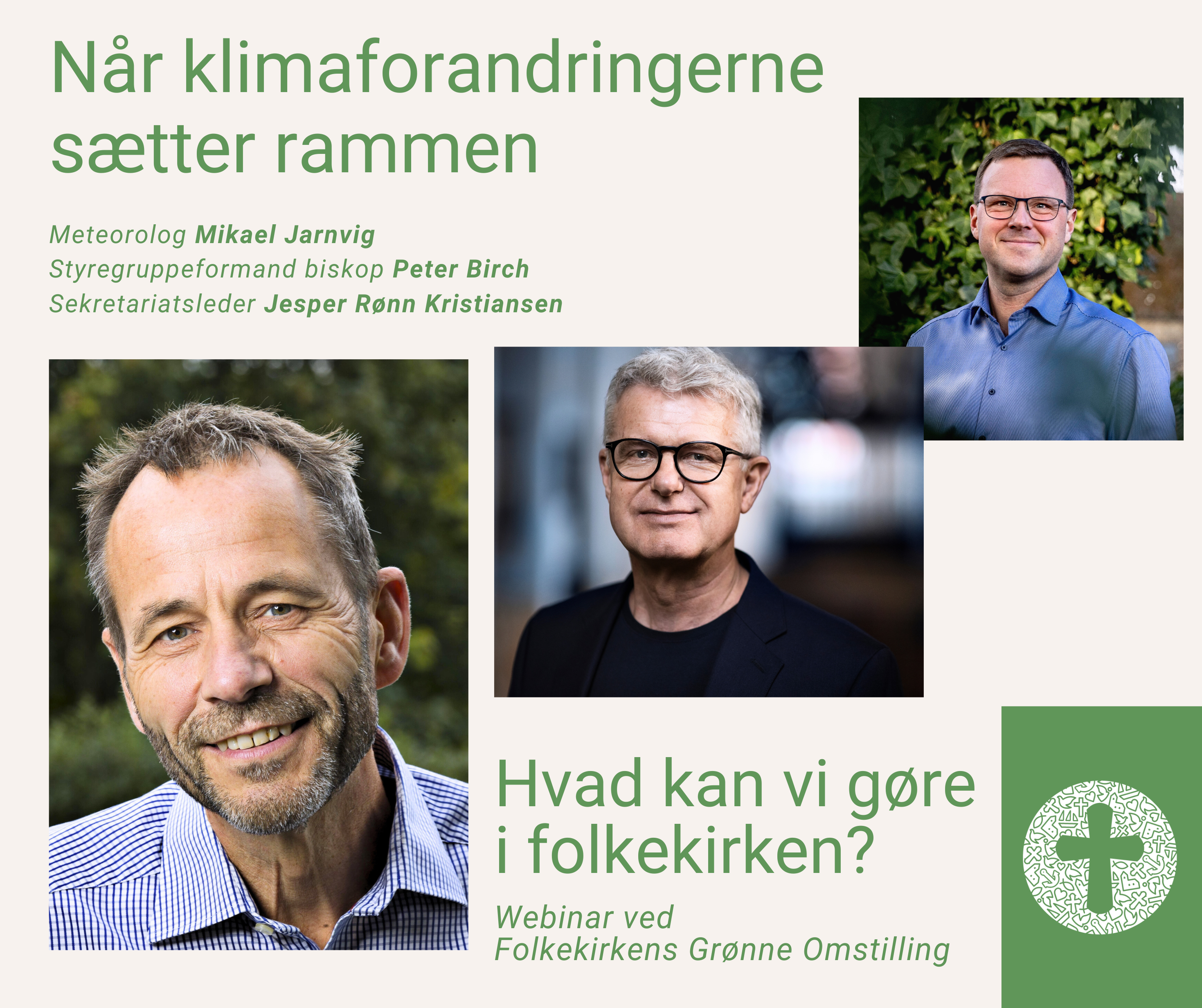 Hvad betyder klimaforandringerne konkret for jeres kirke? På dette webinar får I et aktuelt overblik over klimaets udvikling, og indsigt i hvorfor det har betydning for folkekirkens opgaver, bygninger og jorder i de kommende år. Meteorolog Mikael Jarnvig giver et klart og letforståeligt indblik i klimaforandringerne, og de vilkår de skaber. På den baggrund præsenteres Folkekirkens Grønne Omstillings arbejde og fokusområder de kommende år. Webinaret klæder jer på til at prioritere, planlægge og tage stilling til de valg, der venter lokalt.
